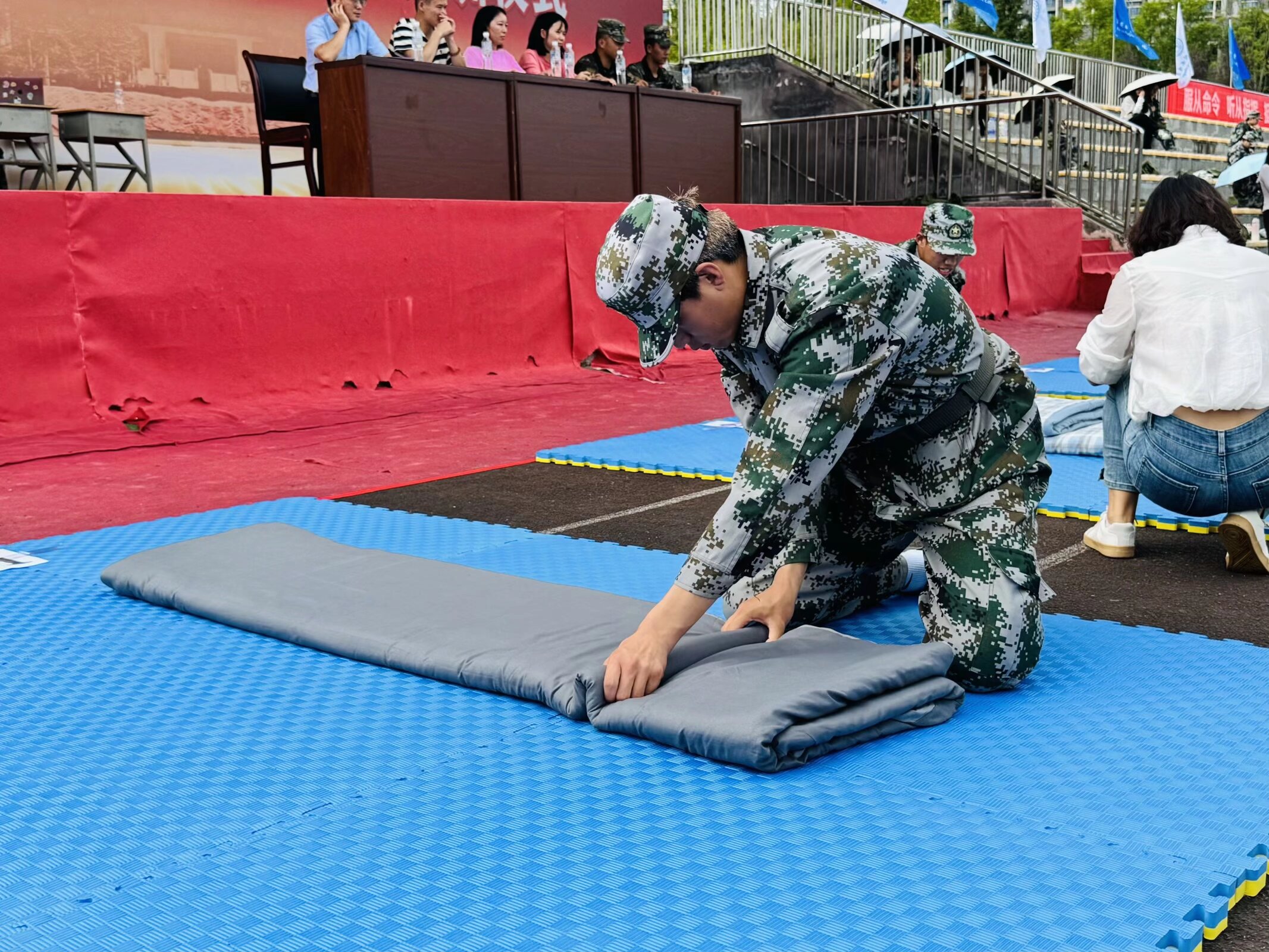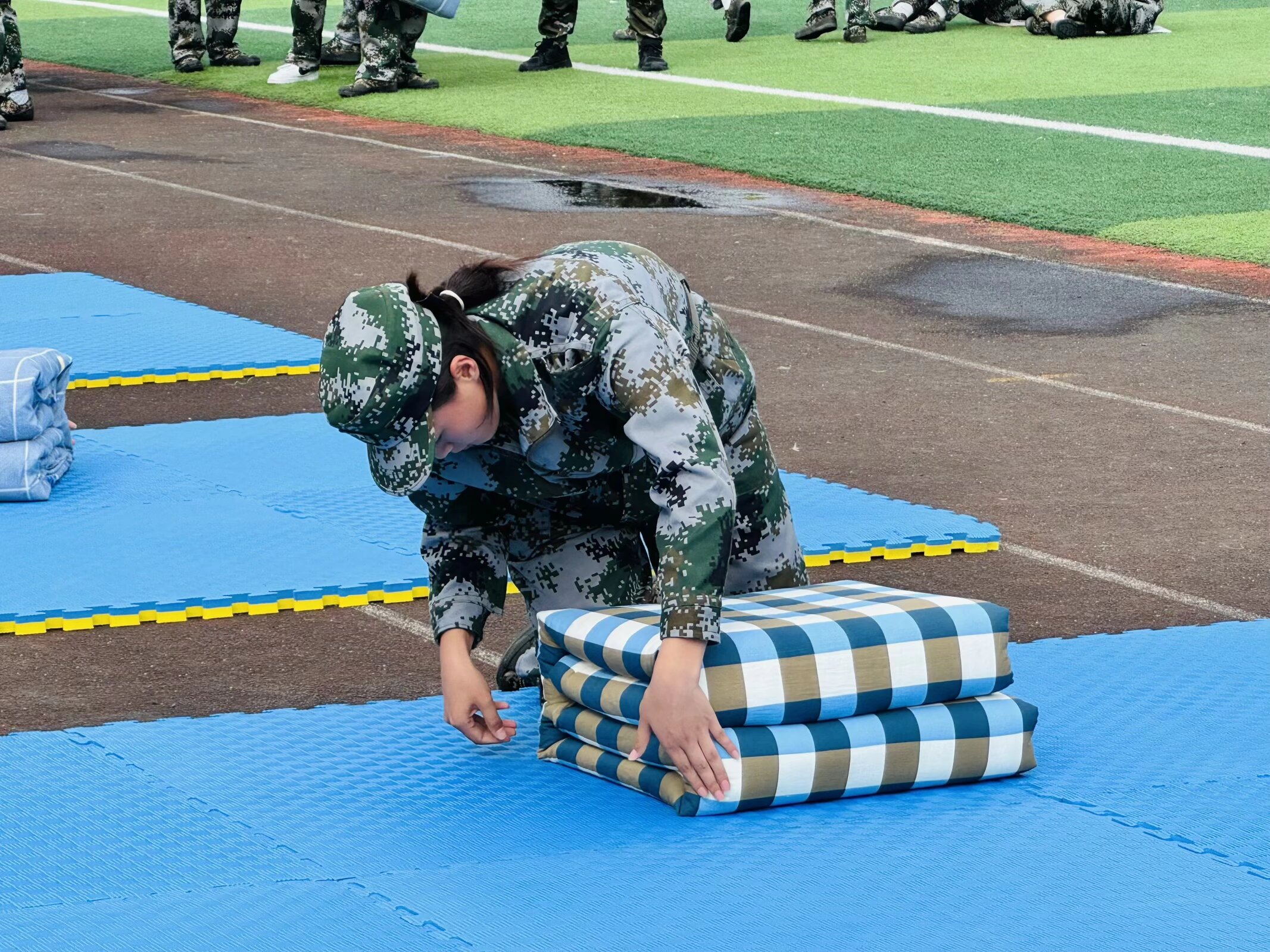 比赛过程中,参赛同学严格遵循“压、折、捏、修”四步法,专注投入被子整理。从按压定型、精准折叠,到细致捏出棱角、反复修整线条,每一个步骤都有条不紊,最终将被子叠成棱角分明、线条笔直的“豆腐块”,确保折痕对齐、角度标准,充分展现了我们学子对细节的极致追求。