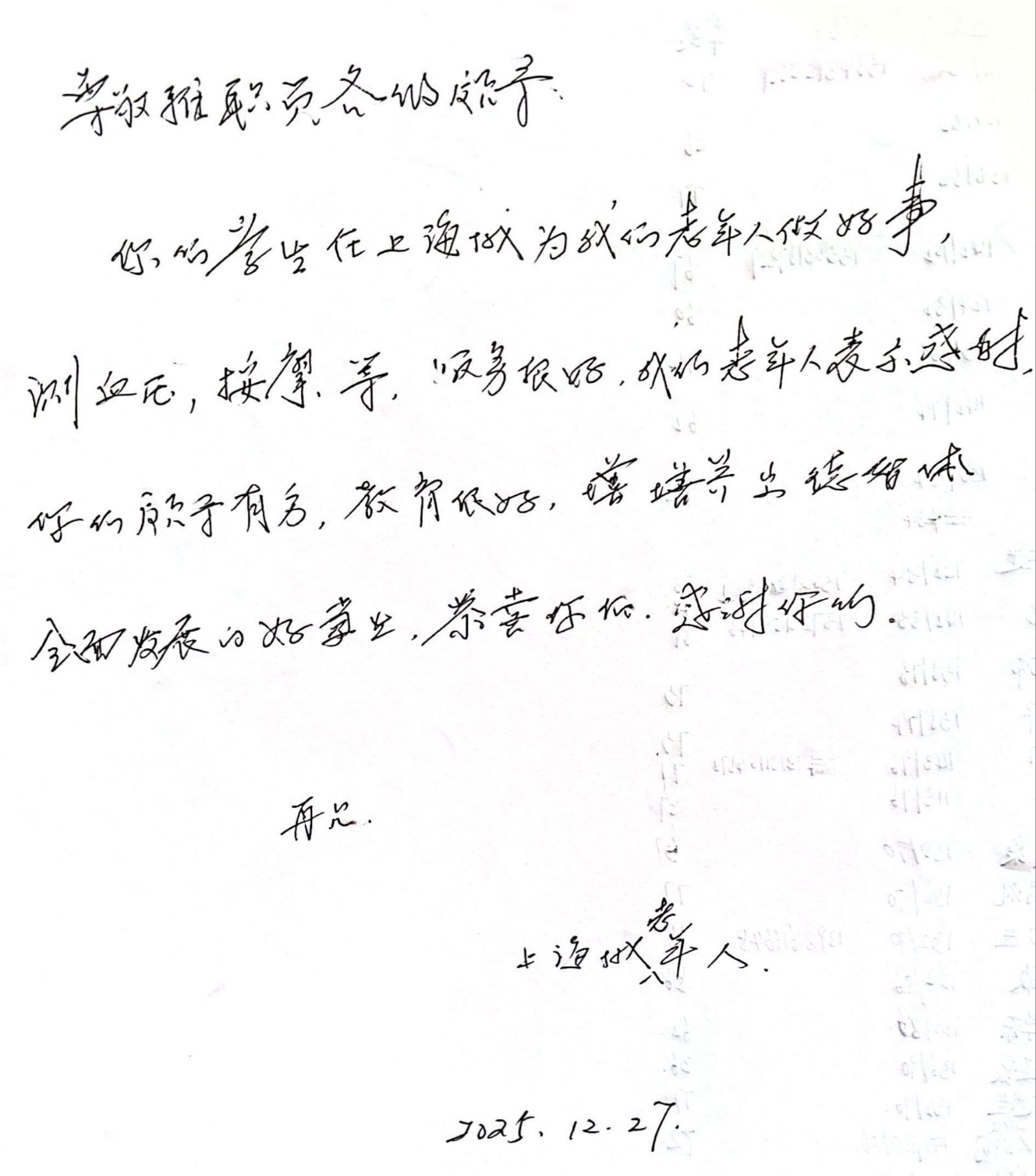 活动现场,志愿者们将专业知识转化为劳动实践,为居民测血压75人、肩颈按摩40人并科普慢性病防治常识32人。上海城老年居民手写感谢信,称赞志愿者的优质服务,称赞学校育人有方,培养出德智体全面发展的优秀学生。